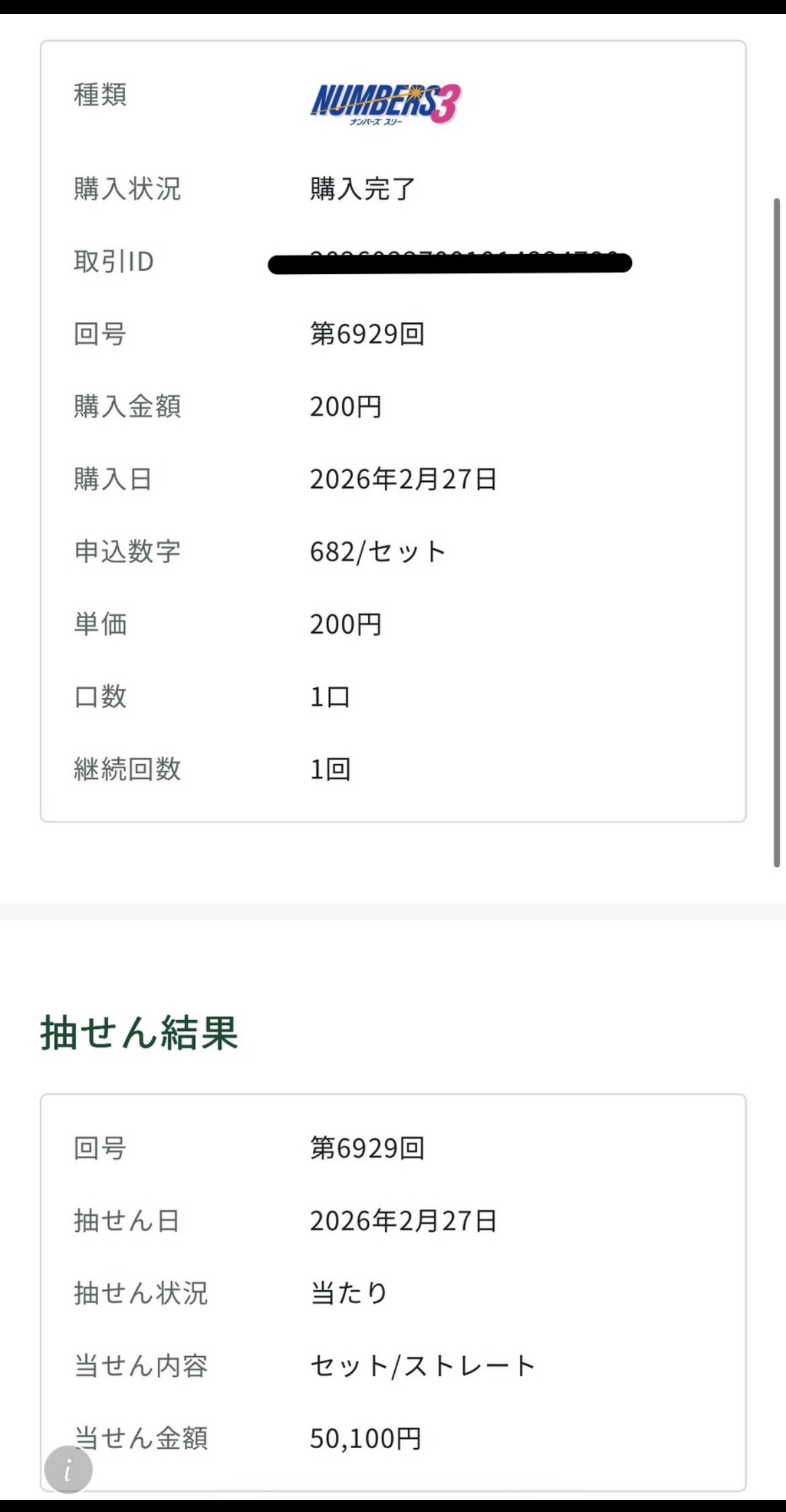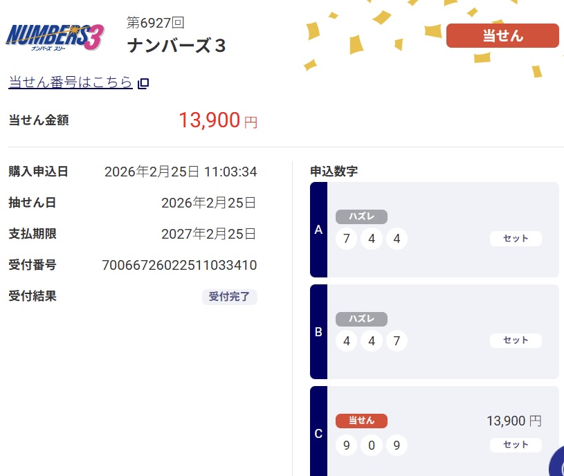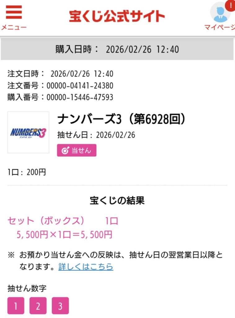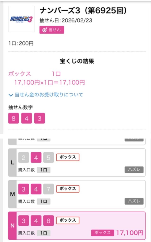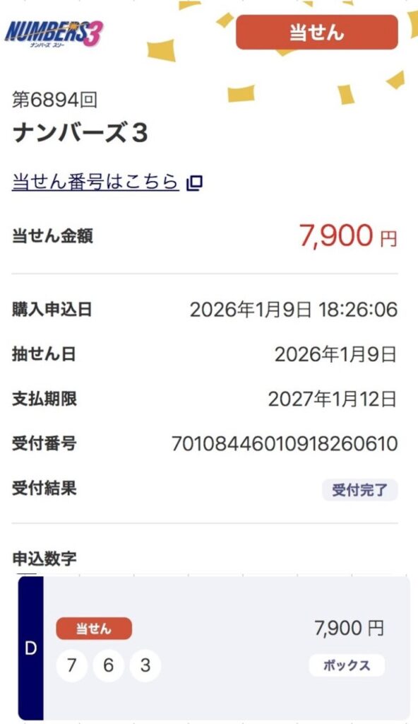 当選報告です。ナンバーズ3ボックス当選しました。ありがとうございます。これからも頑張ります。