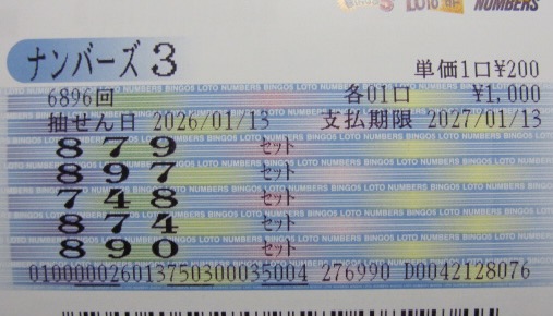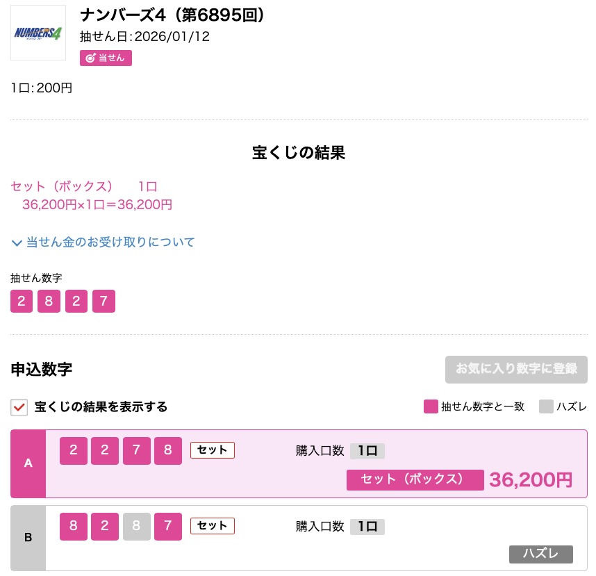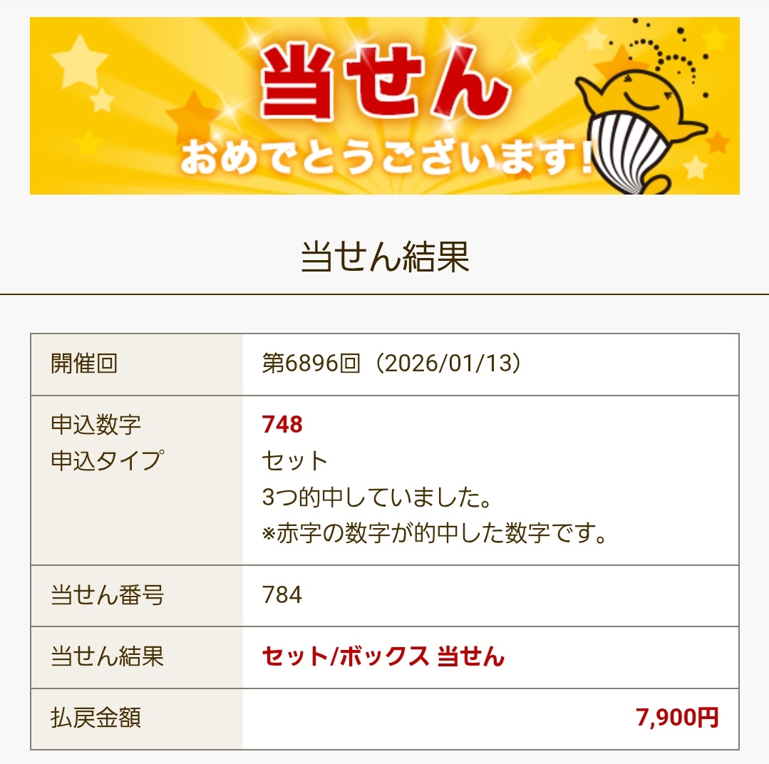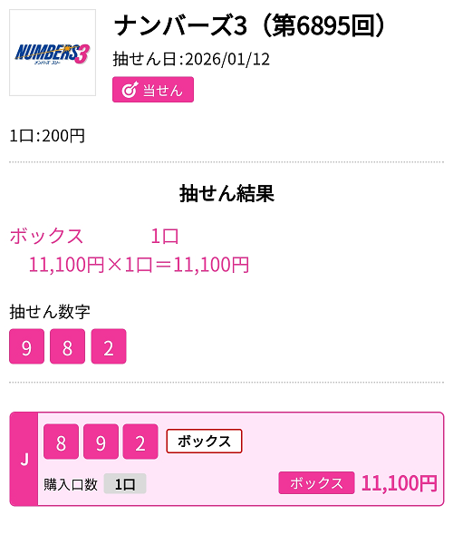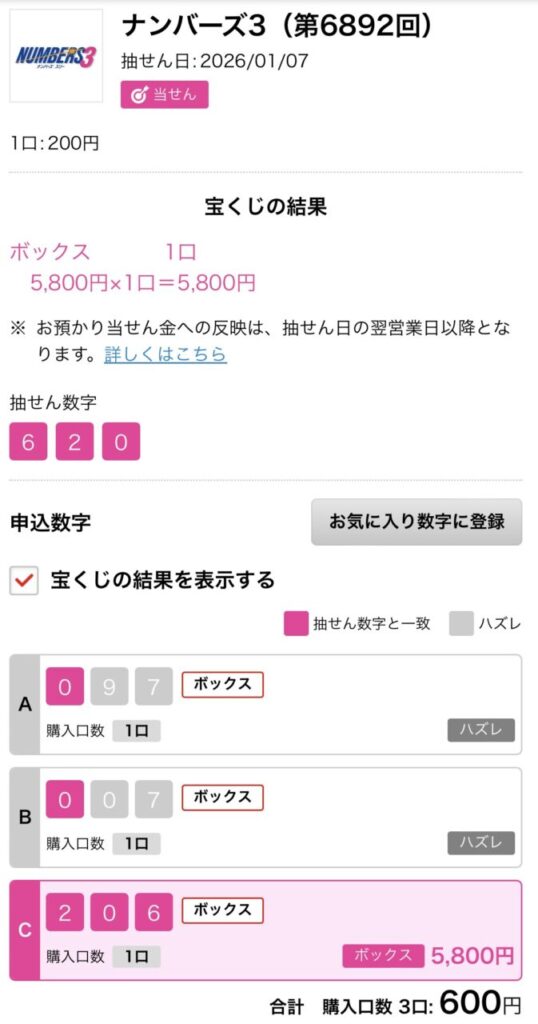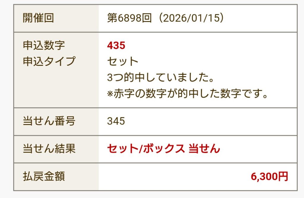 選んだ数字でナンバーズ3のセットボックス当選できて嬉しいです。