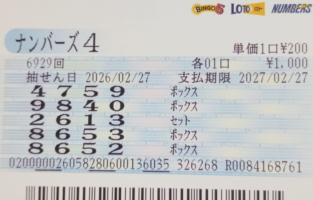 ナンバーズ4 ボックス当選!