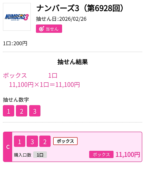 ナンバーズ3 ボックス当選!