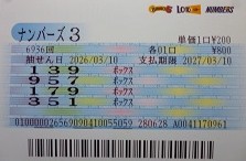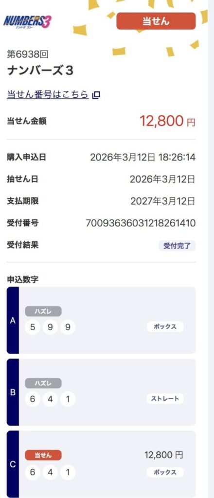 当選報告です。ナンバーズ3ボックス当選しました。ありがとうございます。これからも頑張ります。