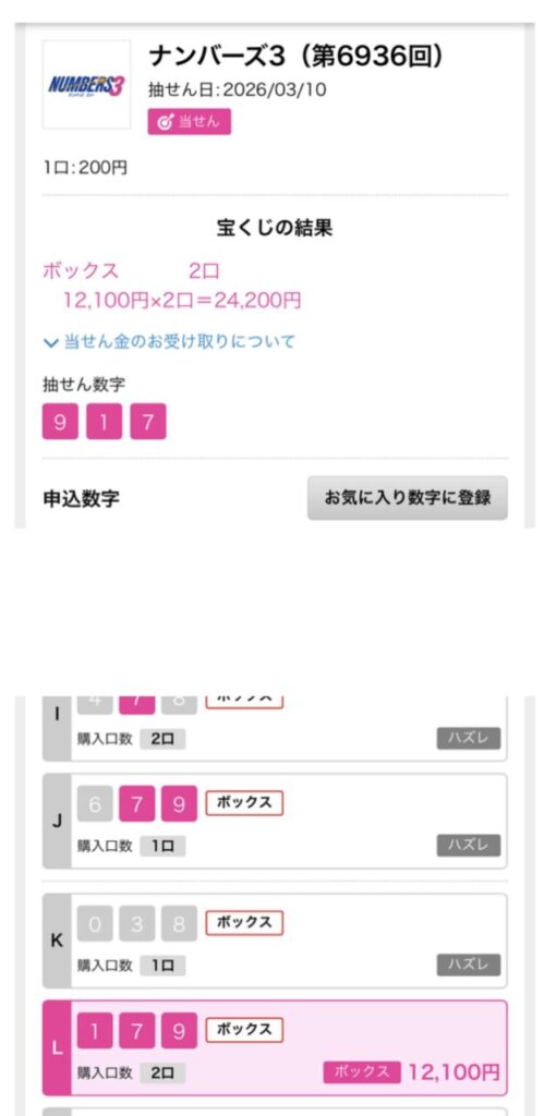 ナンバーズ3ボックス当選しました。