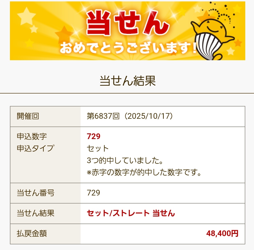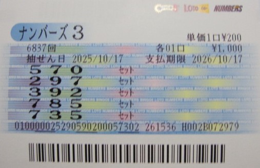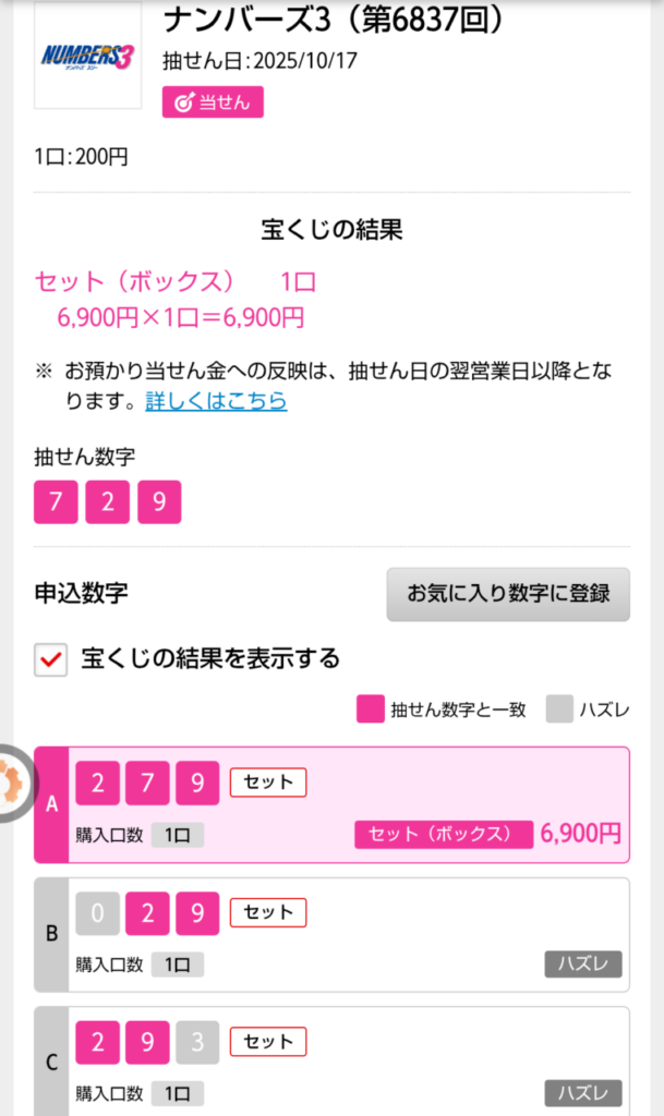 ナンバーズ3 セットストレート当選!