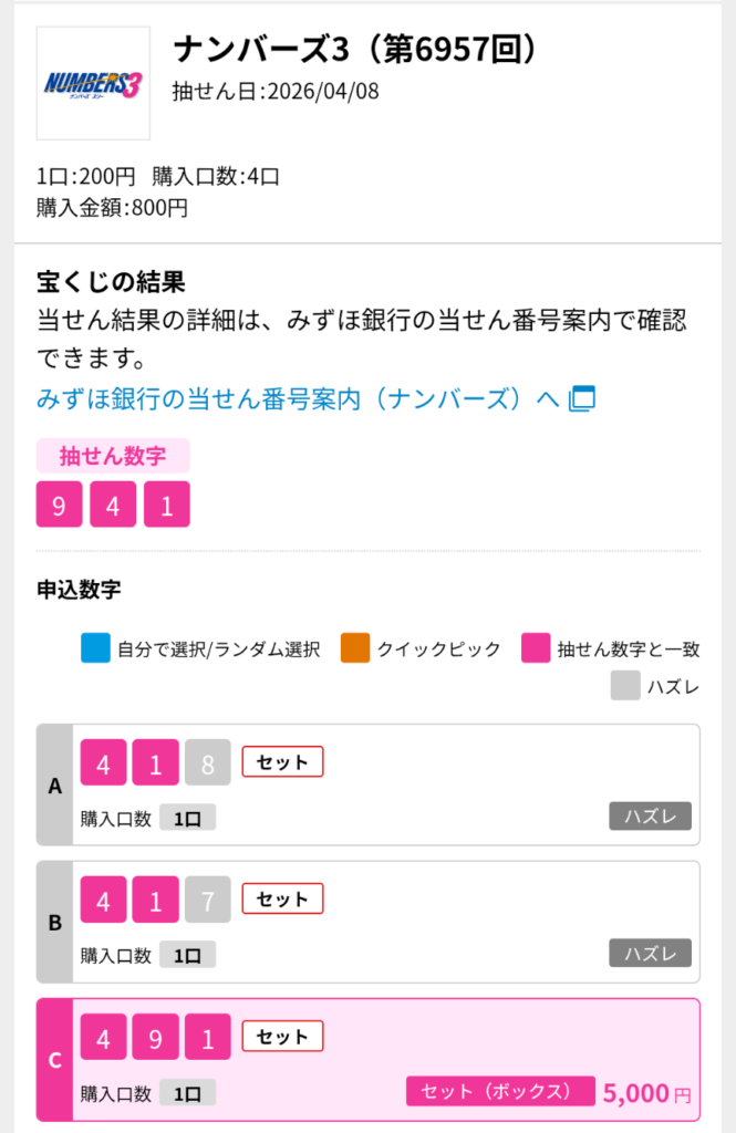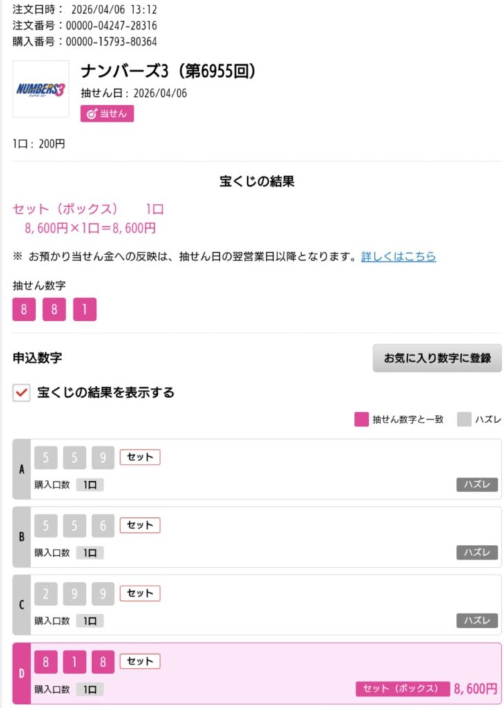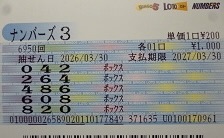 ナンバーズ3 ボックス当選!